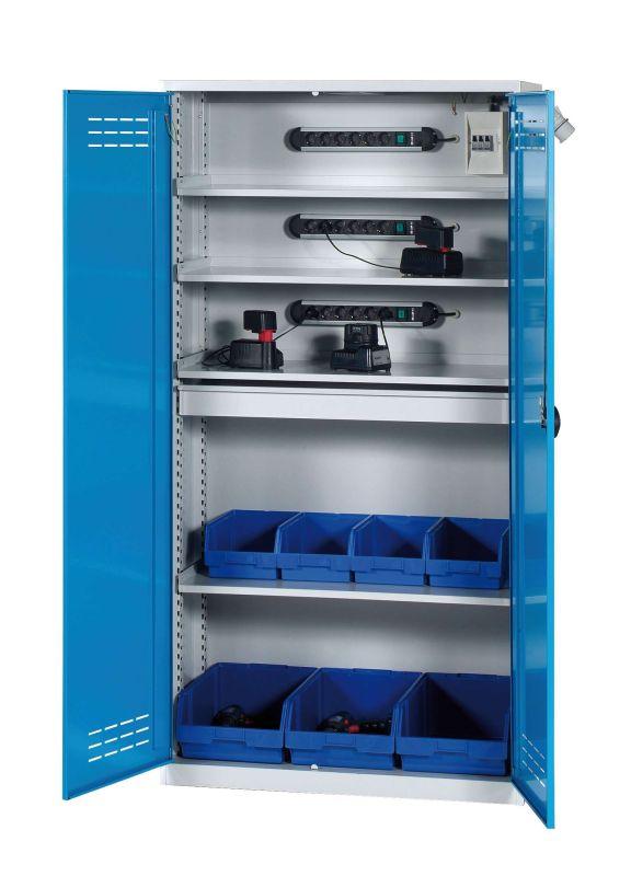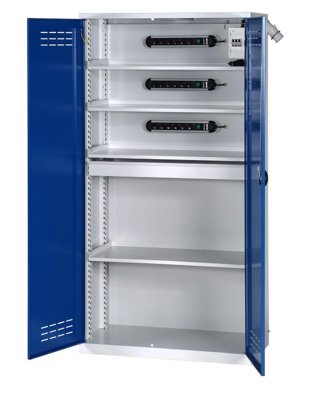 Mit diesen vollausgestatteten Akku-Ladeschränken können Sie parallel eine Vielzahl von Geräten aufladen und sicher aufbewahren. Die Schränke verfügen über eine separate Erdung, drei Schutzschalter im Stromverteilerkasten und Dreipunktverriegelung für maximale Sicherheit. Jede der drei bzw. vier Lagerebenen sind höhenverstellbar, tragfähig bis max. 60kg und jeweils ausgestattet mit 6-fach Steckdoesenleisten mit 230V inkl. Ein- und Ausschalter. Maximal dürfen sechs Ladegeräte je Ladeebene angeschlossen werden. Die Türen sind verschließbar mit Drehriegelschloss und zwei Schlüsseln. Die Ladeschränke sind selbstverständlich auch CE-zertifiziert und GS-geprüft.Die Ladeschränke sind in 28 Standardfarben ohne Aufpreis erhältlich.